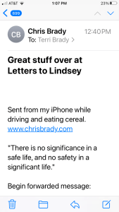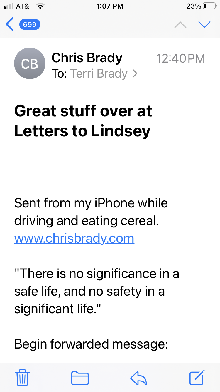 • Clicked “publish,” which automatically emailed you and posted the link on Twitter, LinkedIn and LettersToLindsey Facebook page