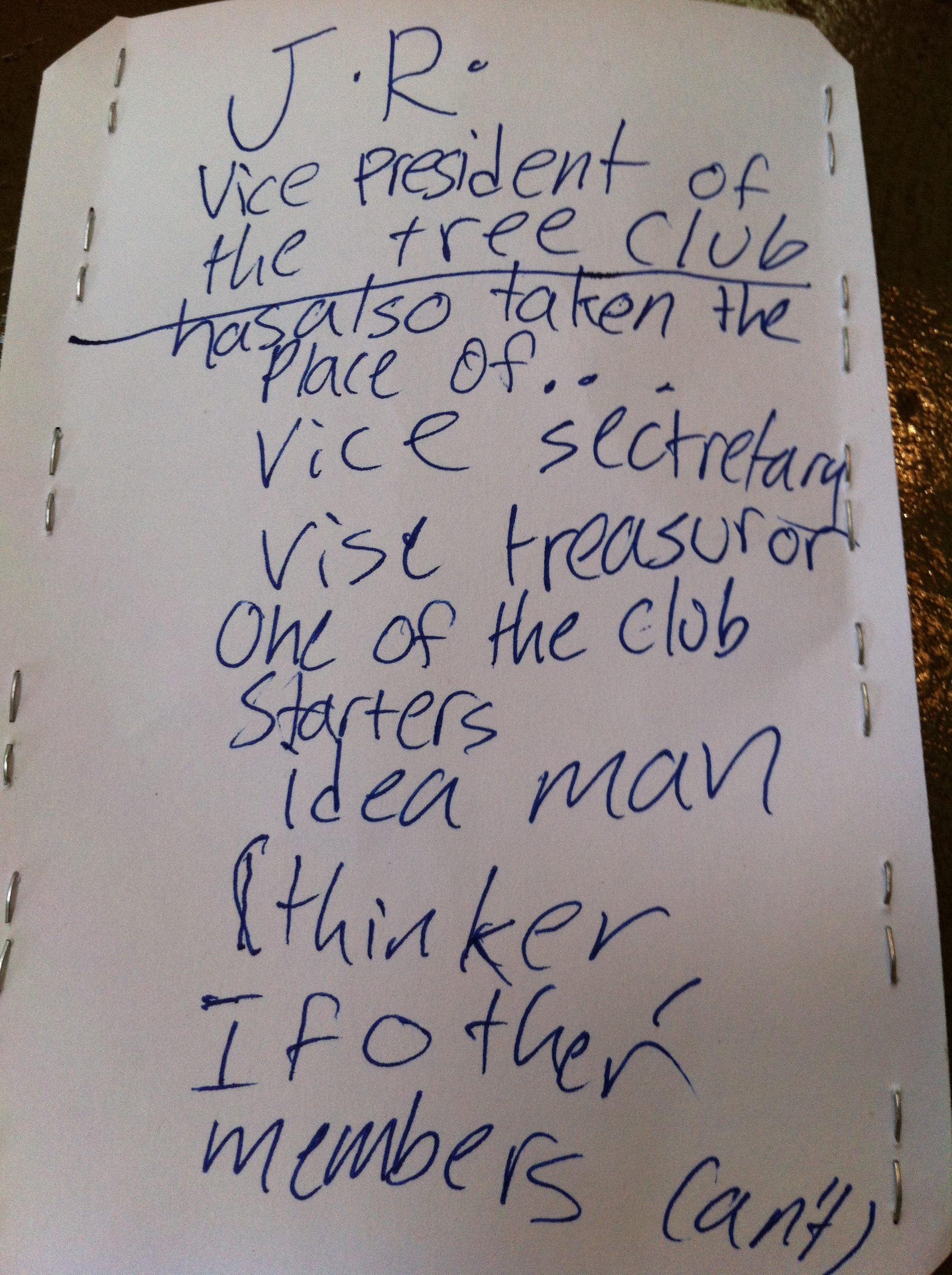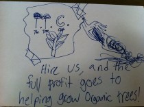P.S. They started their own “save the trees” club. TTC stands for “The Tree Club” and its purpose is to collect money to buy the trees at the Farmers’ Market so none of them gets thrown away. One of J.R.’s many titles is, “Idea Man: thinker if other members can’t”.
